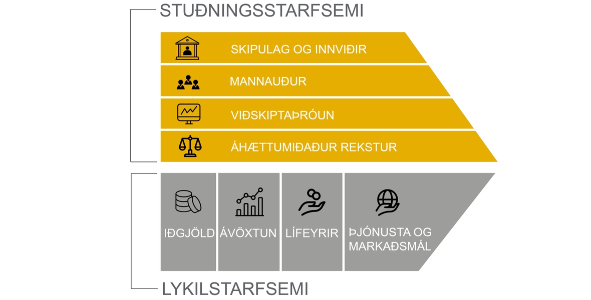 Til að styðja við lykilstarfsemina skipuleggur stjórn sjóðsins starfsemina með skipuriti og í samræmi við lög og reglur. Stjórn og stjórnendur setja innri reglur, hafa eftirlit með rekstrinum og tryggja að starfsemin byggi á traustum innviðum. Öflugur mannauður er sjóðnum nauðsynlegur, þetta er stjórnendum ljóst og hafa því lagt ríka áherslu á að tryggja sjóðnum hæfan og öflugan mannauð til starfseminnar. Snar þáttur í stuðningsstarfsemi er viðskiptaþróun sem ætlað er að fanga tækifæri í ytra umhverfi og styðja sem best við lykilstarfsemina og þróun hennar, til að mynda með innleiðingu á tæknilausnum sem auka skilvirkni, hagkvæmni í rekstri og bæta þjónustu við sjóðfélaga. Rekstur sjóðsins er áhættumiðaður þar sem sérstaklega er tekið tillit til margvíslegrar áhættu við rekstur og eignastýringu og leitast við að stýra áhættu í samræmi við áhættuþol og áhættuvilja stjórnar.